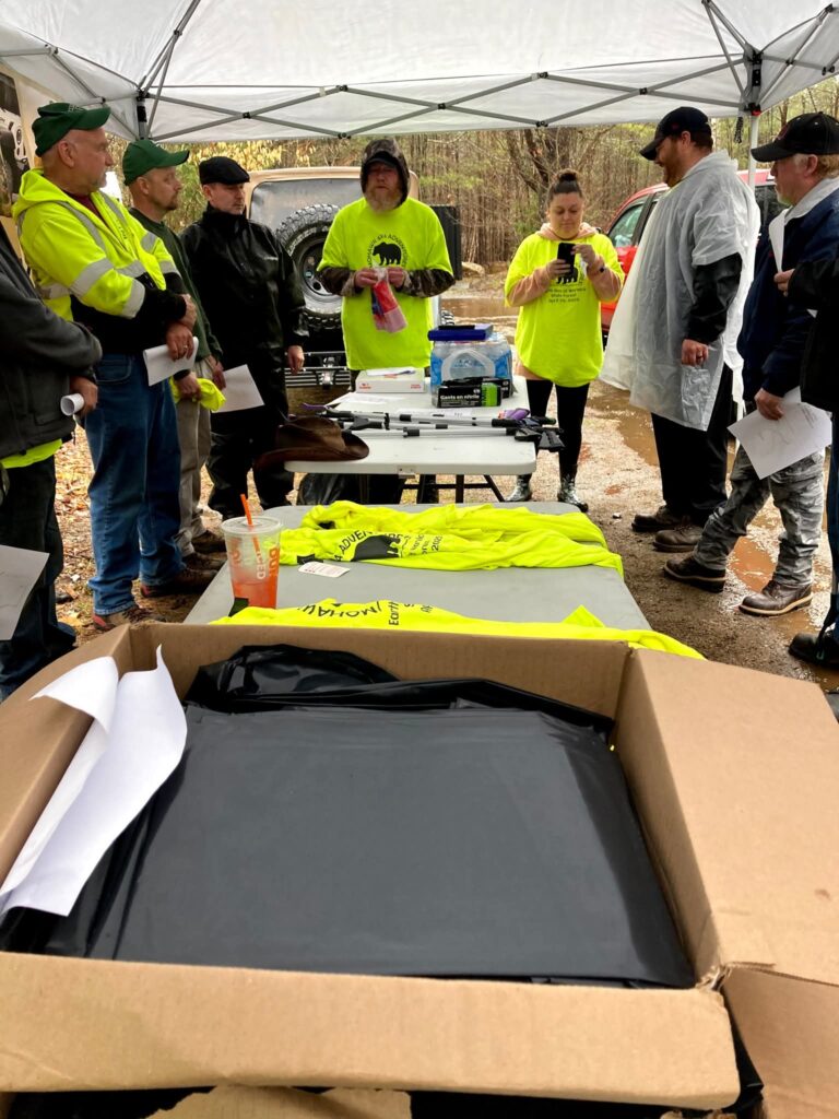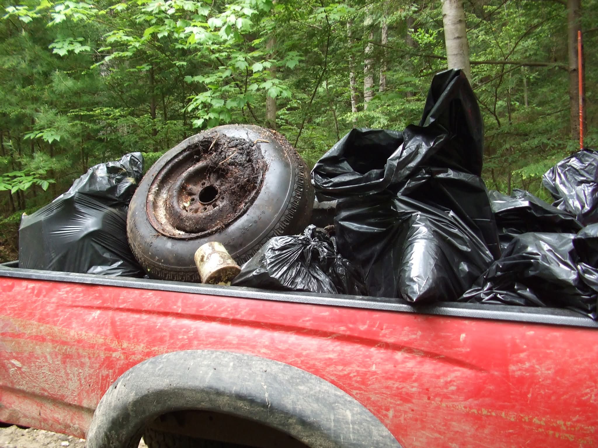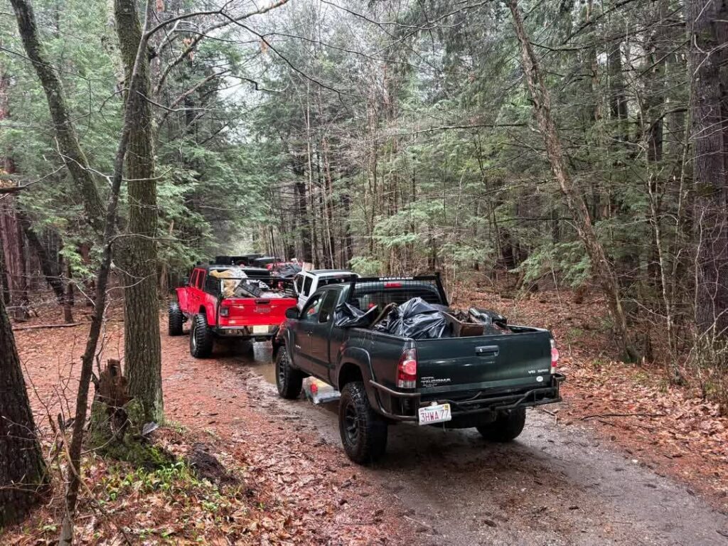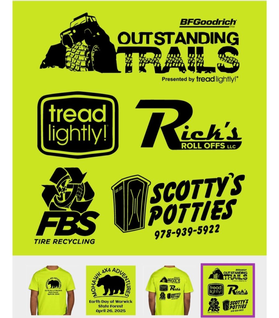 Volunteers, safety tee shirts, pick up tools, garbage bags, banners, DCR staff and Mohawk 4×4 Adventures volunteers.These tee shirts are printed on safety colors, and were required equipment. The weather was terrible, but here’s a good shot of the front of the tee shirt.Our sponsors for the event were awesome. These businesses helped us navigate the most successful line through many obstacles.This Toyota Tacoma hauled a huge load out of the woods on this trip. This Tacoma is pictured during its first run through the forest. In this case, the member and his wife volunteered for 8 hours, to pack their truck full of trash and deliver it to our donated dumpster.This Jeep Gladiator hauled out tires to our tire dumpster from FBS Tire Recycling. When we were scouting the roads for this clean up, we had spotted a pool liner, down by a stream. It was more than just the pool liner, it was most of the pool.Our volunteers were able to get pool from the stream bank to the dumpster, provided by Rick’s Roll-Offs, LLC.This trophy was spotted in 2024, and pinned on GPS. It turned out to be a spelling bee trophy. After the Earth Day Clean-up was complete, the trophy was tightened up, and used as a prize for guessing, without going over, the weight inside the dumpster on a Facebook contest. Amy (red Gladiator) won the contest! The weight in the dumpster was 2180 lbs.“What am I looking at?” That, my friend, is a rocking horse. It is zip tied into a tree. During one of the scouting trips, we had come across teenagers on ATVs and dirt bikes, who had come south from NH. They got the rocking horse cut down, and we set it aside for collection during the clean-up. The problem was – it disappeared before the clean-up. A horse is a horse, unless, of course, unless it’s a magical rocking horse… The Horse was located again on Nov 16th by volunteers and DCR employees. We decided the mythical mascot could stay. It is a little dangerous to remove, it’s off the ground, and it is kind of funny archeology.“Just take those old records off the shelf, I’ll sit and listen to them by myself.” We found two acoustic guitars together.Volunteers removed an entire living room furniture set, up a steep hill. Dirty, moldy, rotted furniture that was probably left here 20+ years ago. Here’s Rick of Rick’s Roll-Offs, LLC. Rick donated the dumpster use, delivered it, came back with his Jeep, volunteered during the entire clean-up and came back the next day to get the dumpster. His company also donated any fees needed for items that required payment to dispose of legally where he unloaded. This kind of volunteerism by club members is next level above and beyond.FBS Tire Recycling donated and delivered this enclosed container for all our our tires and tires and wheels. We ended up with 38 pieces in this dumpster. Our club members are top tier people, enjoying and maintaining top tier, sustainable trails.Tread lightly! and BF Goodrich Outstanding Trails Program sponsorships were instrumental in this entire process. They supplied tools and supplies, and funded our volunteer tee shirts to make this project a success.
